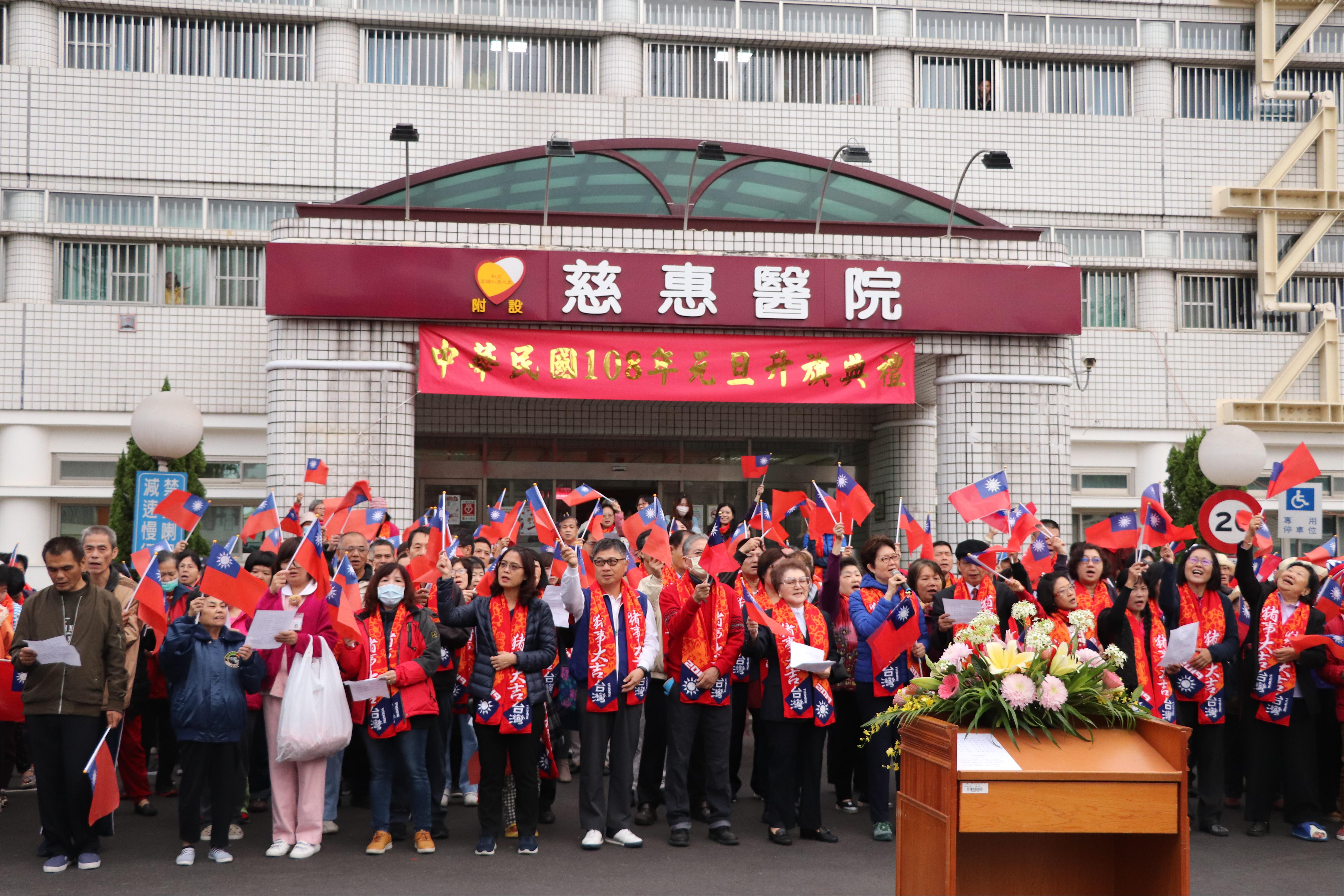 本家舉辦元旦升旗典禮早已成為多年來的傳統,且今年的參與人數也較往年增加不少。除了本家各個主管、同仁,各單位的病友、家友及長輩們也是踴躍參與,甚至還有附近社區的鄰居來共襄盛舉。元旦上午六時三十分,大夥兒陸續到慈惠醫院前集合,聚在一起感受愛國的氛圍。七時一到,在本家大家長-張雅玲董事長的帶領之下,唱國歌隆重肅穆的氛圍環繞在整個全場,而青天白日滿地紅的國旗、也在全體的歌聲與注目中冉冉上升,這是元旦升旗典禮中,最讓人內心感動、熱血沸騰的時刻。