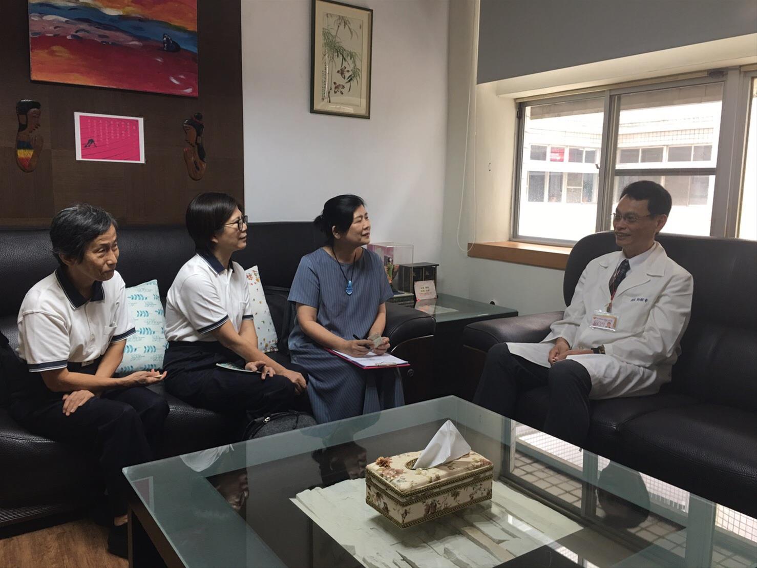 9/18(週三)上午11點法鼓山高雄南區辦事處方麗雲召集委員、陳明吟慰訪關懷組長與本院玫瑰志工隊前隊長洪麗卿(潮州分會)至本院商討到慢性病房帶領活動事宜,本院由社工科麗英及明仁出席,院長也親自到場感謝法鼓山能前來服務。