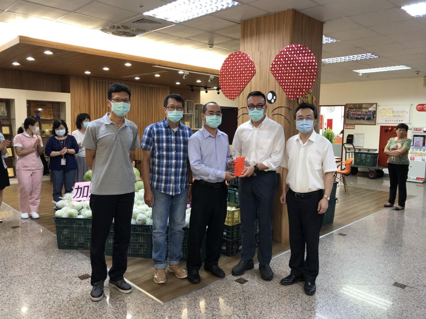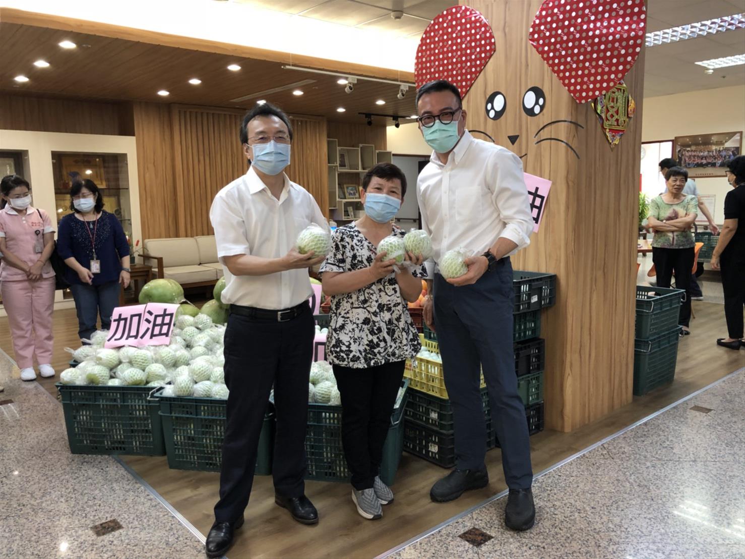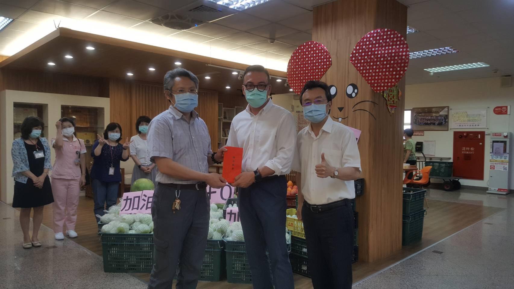 王敬豪董事及林國慶執行長特於5月12日獻上感謝,除謝謝慈惠醫院鍾偉倫院長領導有方,也感恩各業務單位成員的付出與辛勞,會中頒發鍾院長獎金,也購置一大卡車的農產品分享員工。農產品內容有;屏東縣愛文芒果、鹹鴨蛋、燕巢芭樂及象徵零確診的西瓜等為禮品,分送辛勤工作的夥伴們,肯定本家團隊付出。