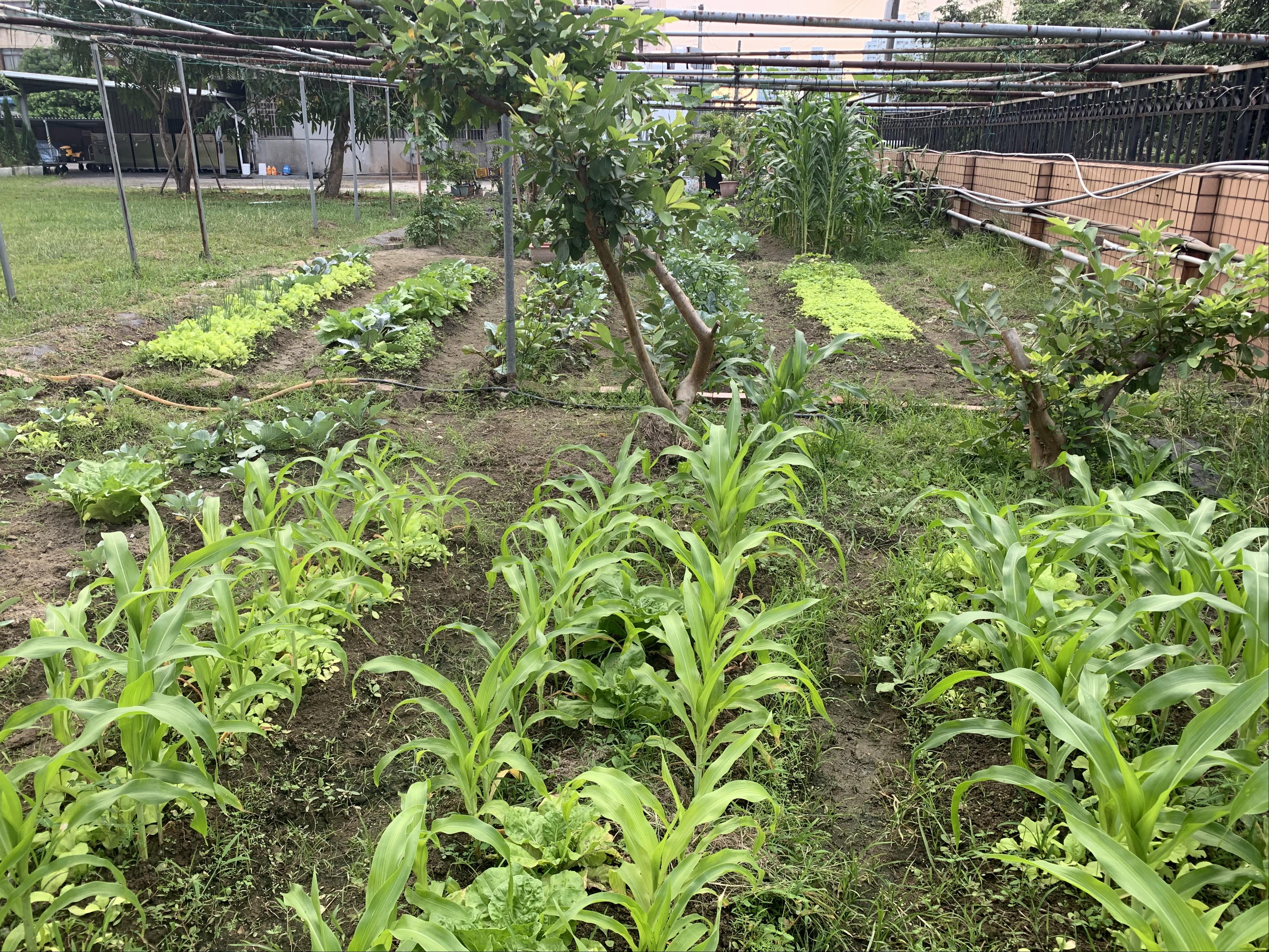 從今年開始,玫瑰園接下美化本家辦公室隔壁空地的任務,在教保督導的策劃下,挖溝、引流、搭棚、播種……將開心農場的雛形建立起,並引進多種不同植物,如高麗菜、花椰菜、蘿蔔、玉蜀黍、百香果、絲瓜、番茄、櫻桃、秋葵等,除了常見的園藝蔬果外也具備高度多樣性,可謂兼容並蓄、百花齊放。