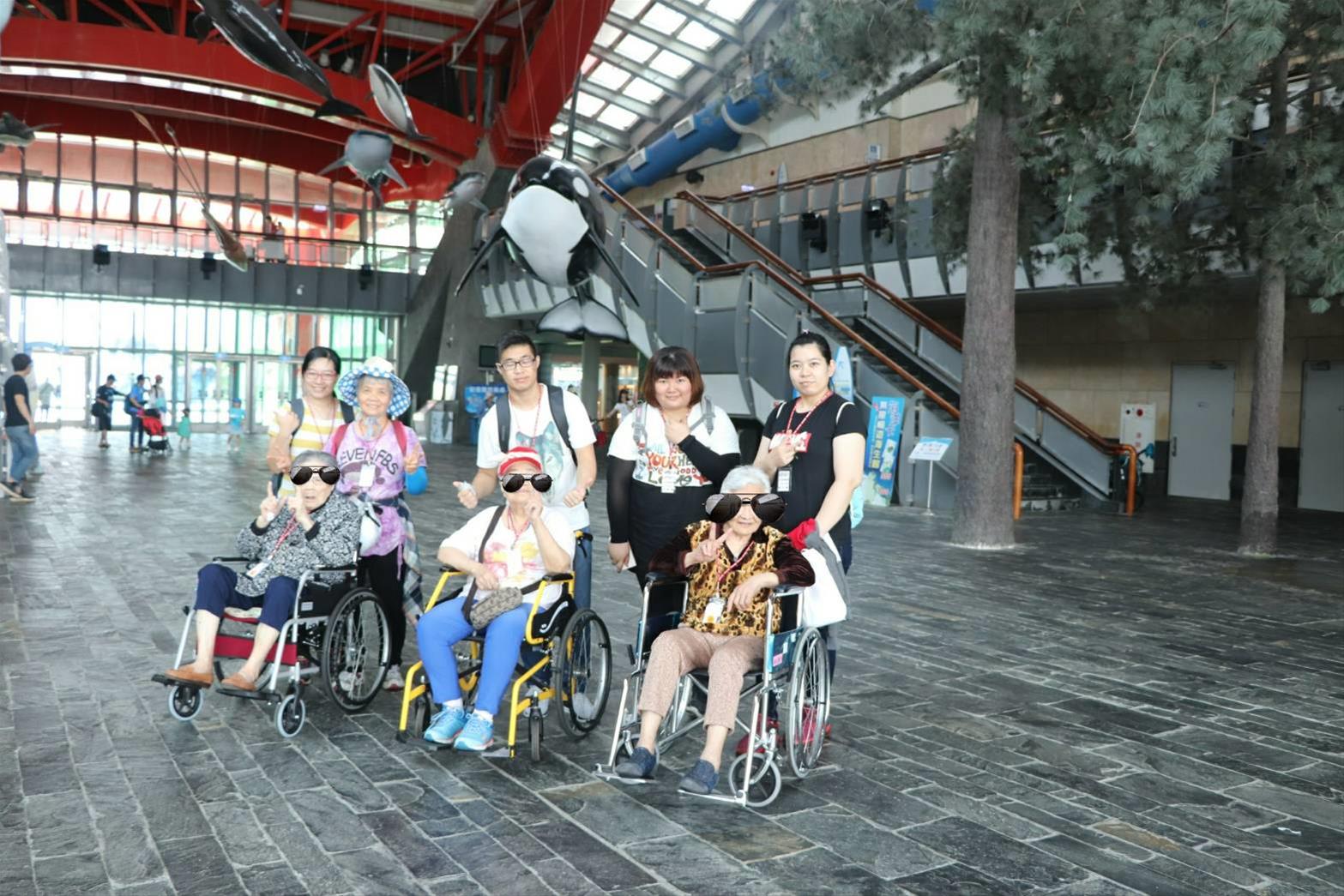 一、二組的長輩第一個參觀的是珊瑚王國,巨大的水族缸、從身邊悠游而過的繽紛魚群、置身海底隧道、欣賞小白鯨可愛的游姿等種種療癒美麗的景象,讓長輩及工作人員驚呼連連。三、四組的長輩首先參觀的是台灣水域館,館內有各式各樣在台灣水域生長的魚種,並介紹台灣水域的獨特性。參觀時間正巧遇到餵食秀,身穿潛水裝備的工作人員拿著餌料,餵食水族缸內的魚群,並配合解說員專業的解說,大家都增長知識了。