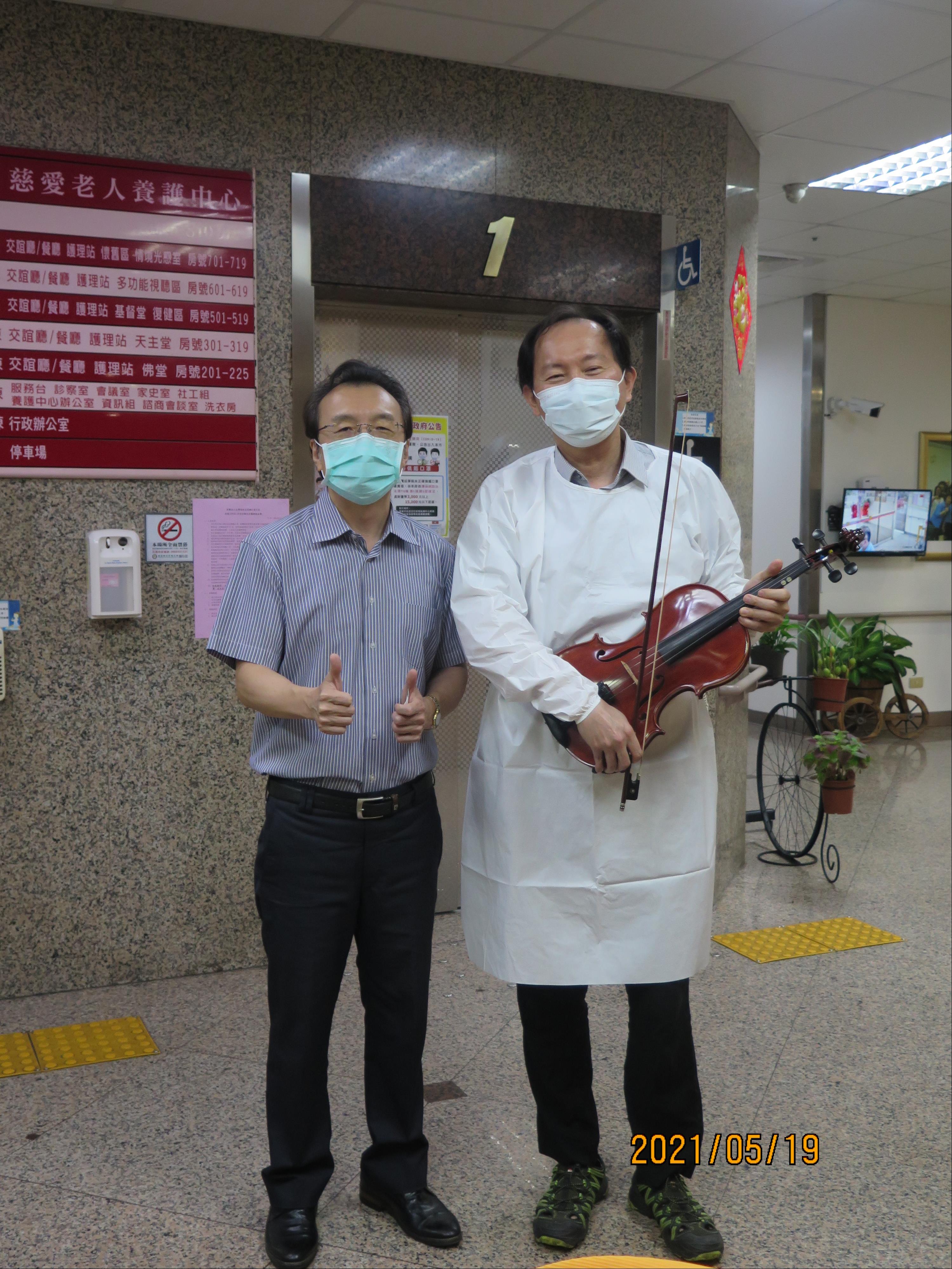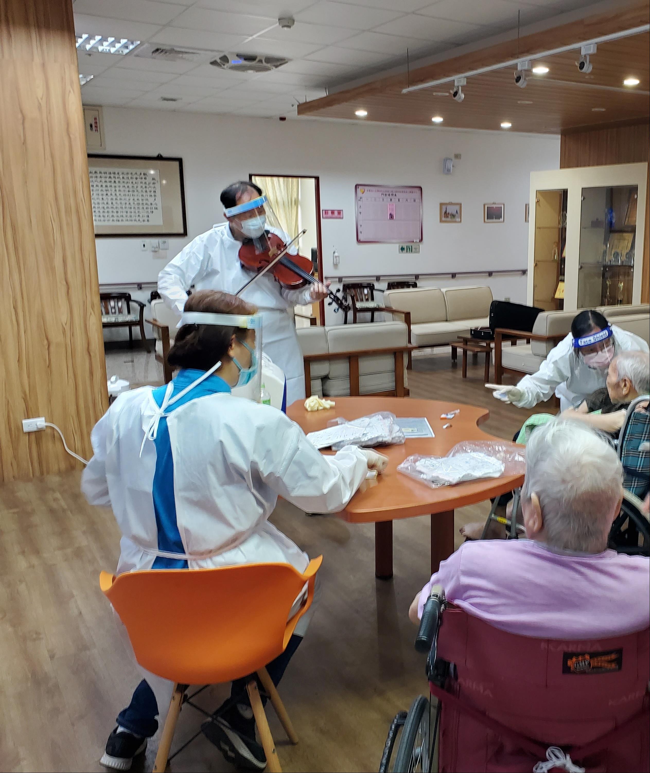 因有些長輩尚未注射到疫苗,所以在6/25安排受恩居護所的醫療人員來為長輩接種疫苗,而受恩居護所的鐘紀陪醫生為了讓要長輩在接種疫苗時夠放鬆心情,自己特地準備了小提琴來為長輩們演奏,讓長輩們在接種疫苗的同時,又可以聽到美妙的音樂演奏,生理跟心理都得到滿足。