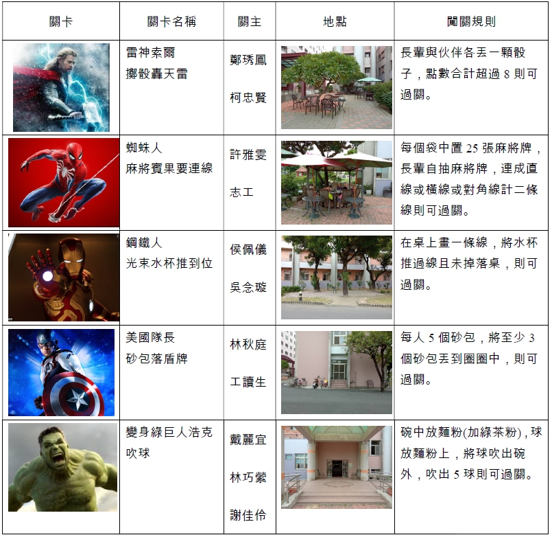 “慢威英雄”顧名思義是由長輩們組成的英雄團體,各個關卡也與美國漫威漫畫英雄主角們脫離不了關係(詳細請見下圖),由工作人員及主辦、協辦單位人員率領之下,長輩們展開了前所未有的挑戰,這個挑戰的終點就是領取豐富獎勵!任務很簡單,每闖一關成功後會獲得一個印章,集滿6個章的話「恭喜闖關成功~!」每位英雄將獲得應有的獎勵~而豐富的獎項內容連我看了都羨慕不已,後面再做介紹。關卡如圖: