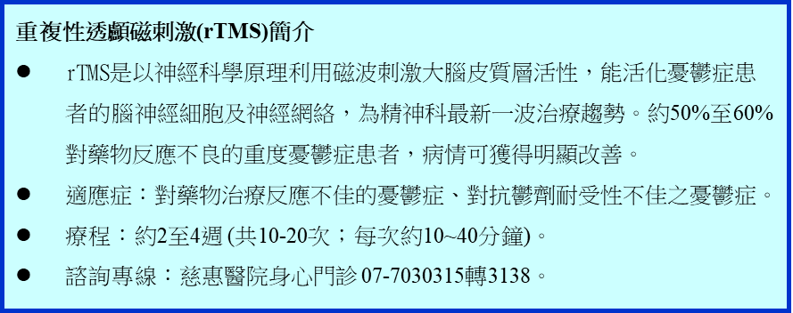 為提升治療服務及發展神經生理回饋,附院近期亦成功導入「Repetitive transcranial magnetic stimulation (rTMS,或簡稱TMS)翻譯為重複性「跨顱磁刺激」,「經顱磁刺激」或「透顱磁刺激」術,在美國核准治療憂鬱症已10餘年,美國已有數百家專門提供TMS治療的診所。台灣衛福部則於2018年4月通過TMS可治療,為鄉親提供更優質且與醫學中心相同水準的醫療服務,而附院優秀的醫師們平日忙於醫療事務,藉著這次餐會好好話家常、互相關懷,餐會就在溫馨歡樂的氣氛中落下句點。(文:家本部/家袐書/林紀瑄)