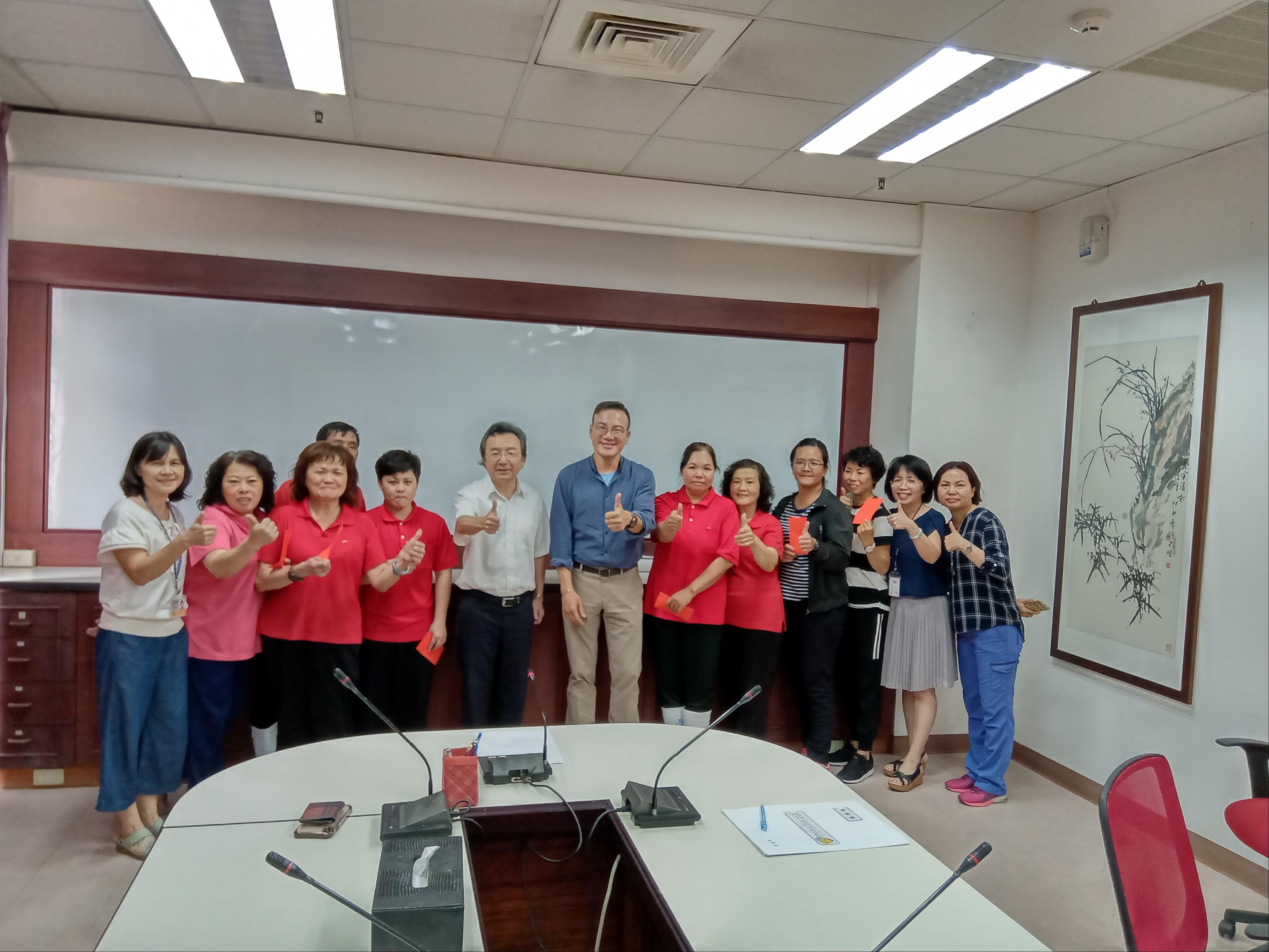 在歡樂的氣氛下,中廚同仁掌聲謝謝郭組長、林家主任與王董事。未來中央廚房將製作更多更特別的餐食給園區家病友及員工!